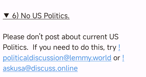 minus-squareCattail@lemmy.worldlinkfedilinkarrow-up2arrow-down1·28 days agoWhy is there a rule against US politics? Like are people asking about US politics too much or what?